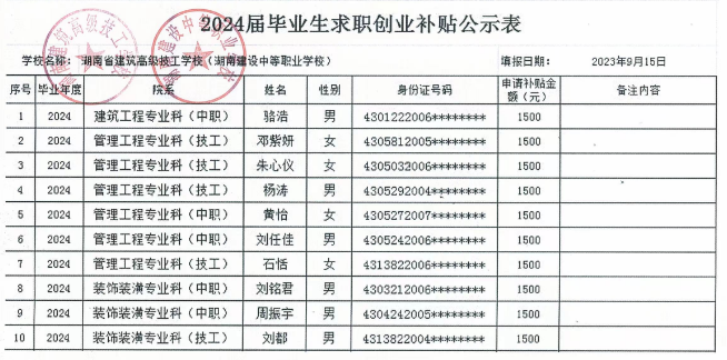 根据《长沙市人力资源和社会保障局关于做好2024届毕业生求职创业补贴工作的通知》文件精神,我校组织学生使用微信完成系统申报,经过各专业科初审和招生与就业办公室复审后有10名学生符合申报条件,现将相关信息予以公示(名单附后)。公示无异议后,学校将上报长沙市人力资源和社会保障局申请发放毕业生求职创业补贴。